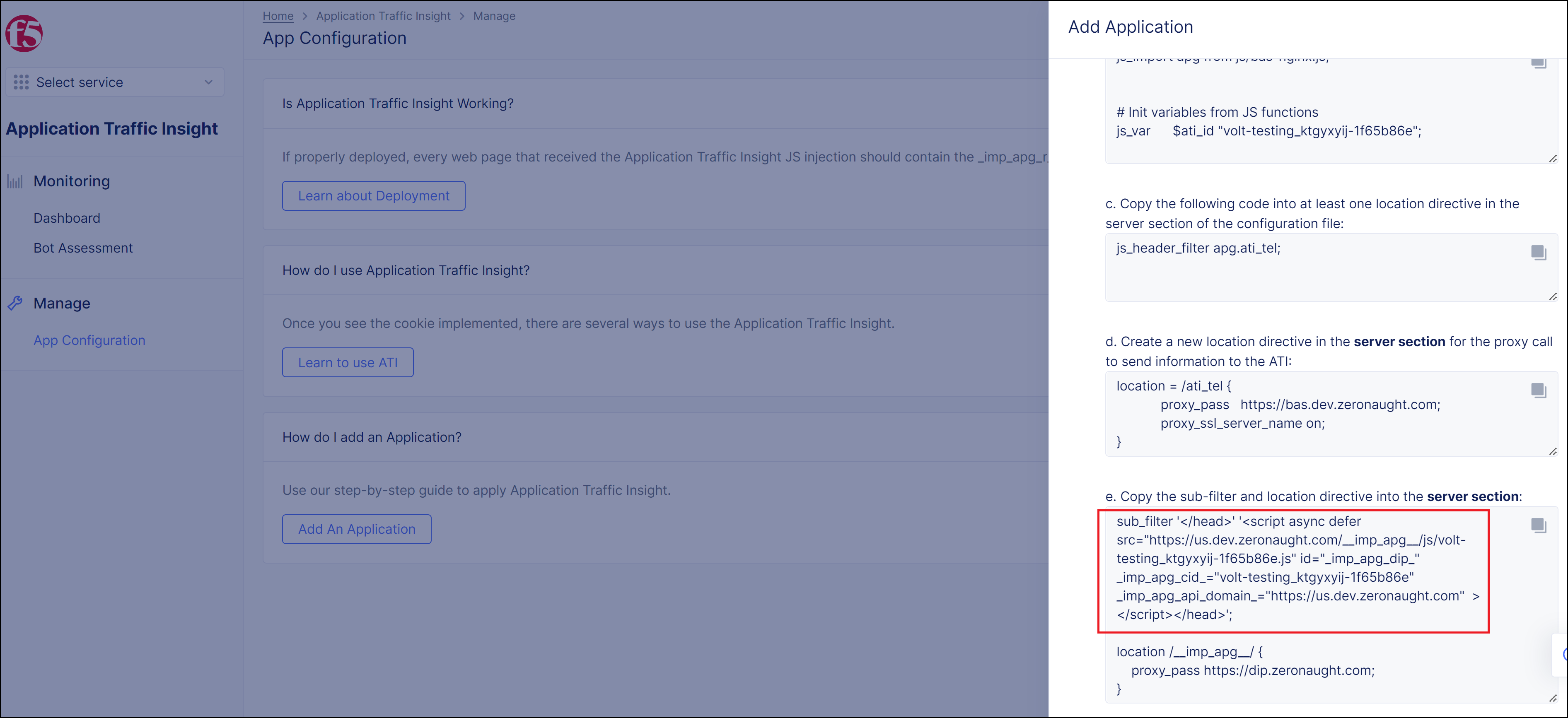 To inject the ATI JS in specific web pages only: If the application path is already defined as a location directive, copy the script tag to the relevant location.